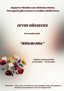 No 2025. gada 27. oktobra līdz 19. decembrim Tukuma 3. pamatskolā būs apskatāma Engures Mūzikas un Mākslas skolas pieaugušo gleznošanas studijas dalībnieces Ievas Ošnieces personālizstāde “BrīvBrīdis”.